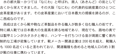 西成は古くから靴や鞄など革製品を作る職人をはじめ、多くのものづくりの人々が住む職人の街です。特に婦人靴では日本最大の生産高を誇る地域であり、現在でも家内工場的な工場が多く密集し、住宅地の細い路地にカタカタと鳴る製甲ミシンの音や底付けハンマーの音が響いています。靴メーカー関連企業が200社を超え、靴職人が1000名近くいると言われ、関連職種も含めると地域人口の3割近くが靴の仕事に関わっています。