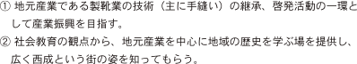 ① 地元産業である製靴業の技術(主に手縫い)の継承、啓発活動の一環と して産業振興を目指す。