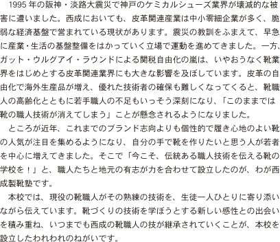 1995年の阪神・淡路大震災で神戸のケミカルシューズ業界が壊滅的な被害に遭いました。西成においても、皮革関連産業は中小零細企業が多く、脆弱な経済基盤で営まれている現状があります。震災の教訓をふまえて、早急に産業・生活の基盤整備をはかっていく立場で運動を進めてきました。一方、ガット・ウルグアイ・ラウンドによる関税自由化の嵐は、いやおうなく靴業界をはじめとする皮革関連業界にも大きな影響を及ぼしています。皮革の自由化で海外生産品が増え、優れた技術者の確保も難しくなってくると、靴職人の高齢化とともに若手職人の不足もいっそう深刻になり、「このままでは靴の職人技術が消えてしまう」ことが懸念されるようになりました。