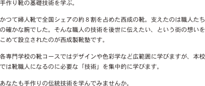 各専門学校の靴コースでは、デザインや色彩学など広範囲に学びますが、西成製靴塾では、靴職人になるための、技術を学ぶ学校となります。