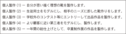 前期で学んだ型紙制作/製甲/底付けの技術を応用・実践する意味で、個人制作に取り組んでいただきます。最初は自分の作りたい靴を自由に制作してもらい、徐々に実際の顧客を想定したモデルの足やニーズに合った靴づくりに挑戦してもらいます。