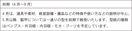 5月以降、製甲については一通りの型を前期で教授いたします。型紙の種類はパンス・外羽根・内羽根・モカ・ブーツを予定しています。