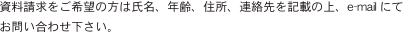 資料請求をご希望の方は氏名、年齢、住所、連絡先を記載の上、e-mailにてお問い合わせ下さい。